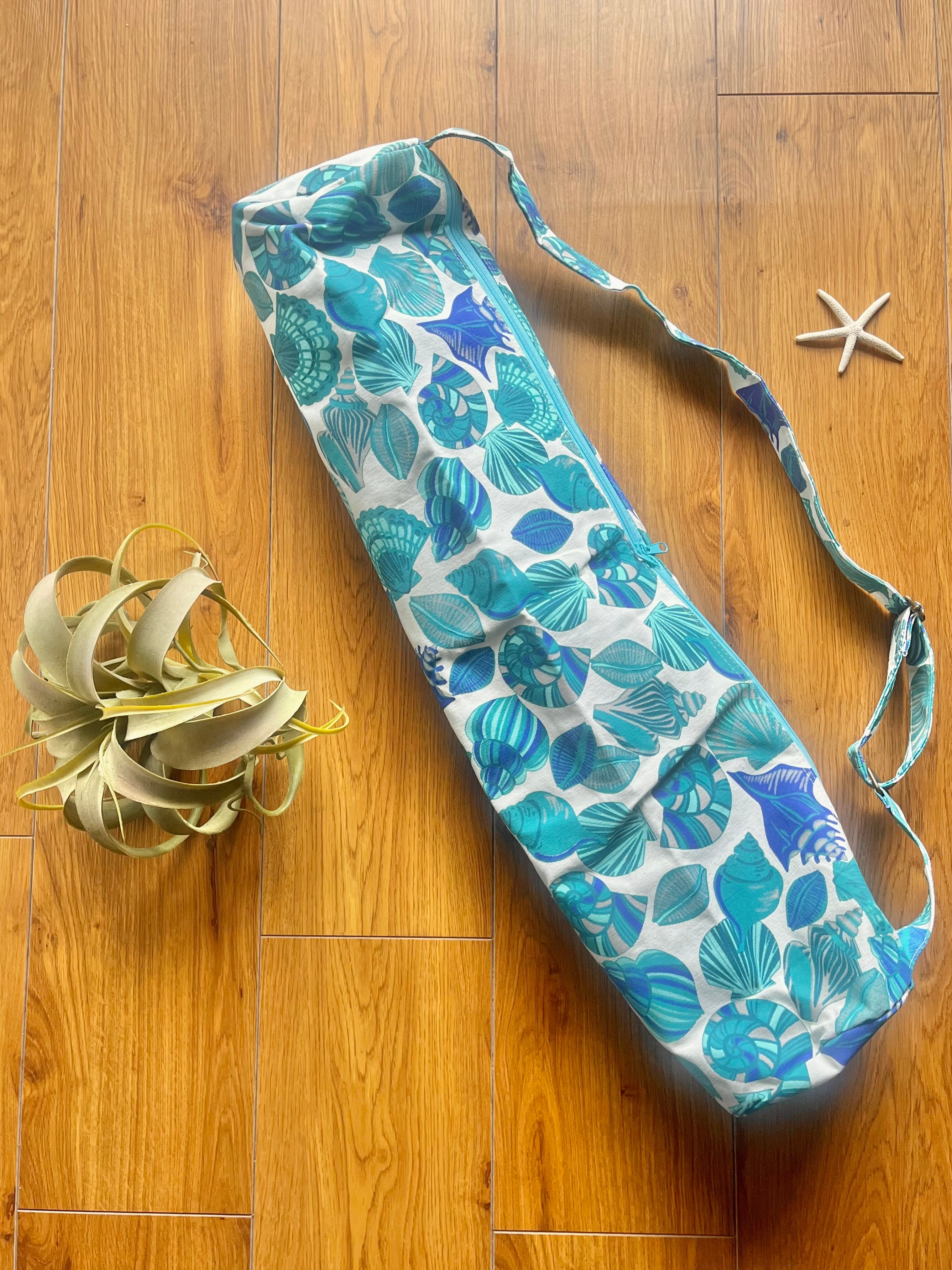 ホワイトにスカイブルーのシェル柄がかわいいヨガマットバッグ❤️