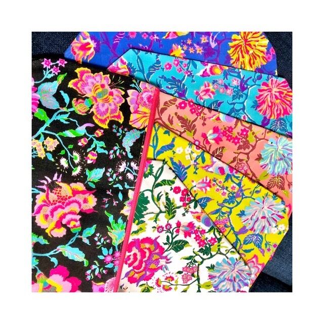 コスメポーチL❤️プチフラワーブルー×フラミンゴピンクタッセル