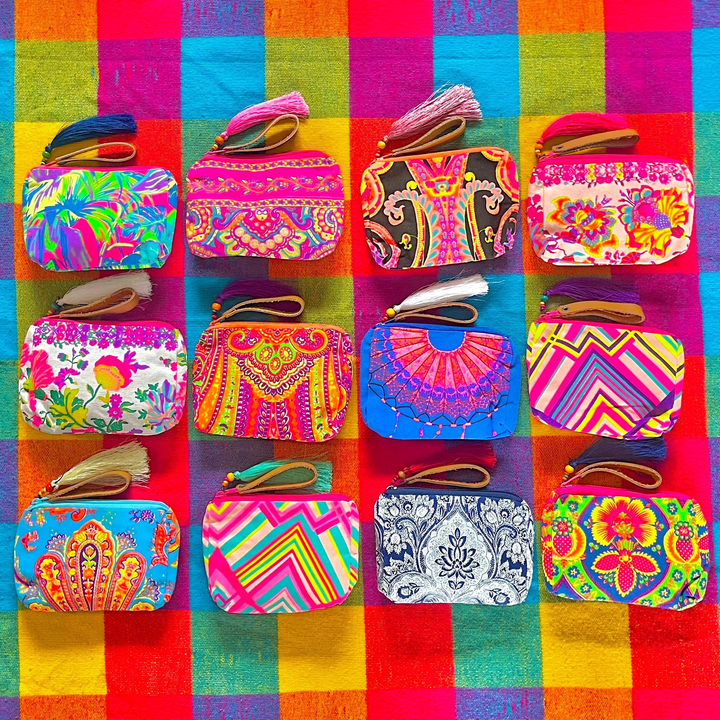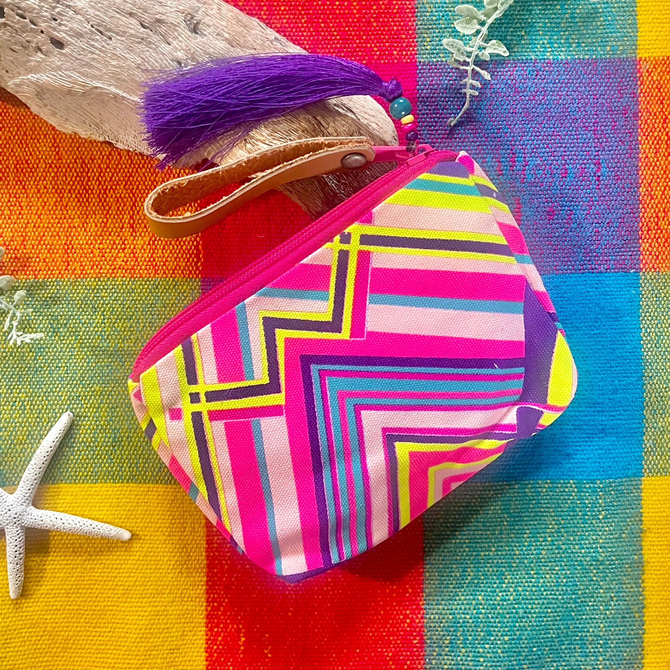 パープル、ピンク、ネエンイエローで織りなす幾何学模様。元気になるカラーリングが素敵なミニポーチ❤️❤️